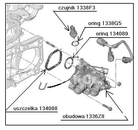kompletna obudowa z termostatem oraz: czujnikiem 1338F3, oringiem czujnika 1338G5, zapinką czujnika 1338C3, uszczelką obudowy 134088, oringiem obudowy 134089
