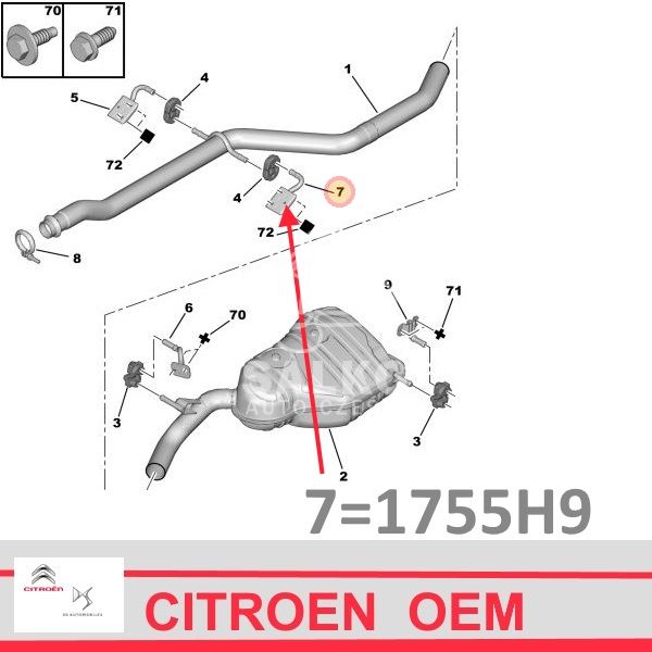 wspornik pod wieszak rury środkowej wydechu Citroen C5 X7/ C6/ Peugeot 407/ 508 nowy oryginał Citroen, stosowany na stronie lewej środkowej rury wydechu, nowy oryginał